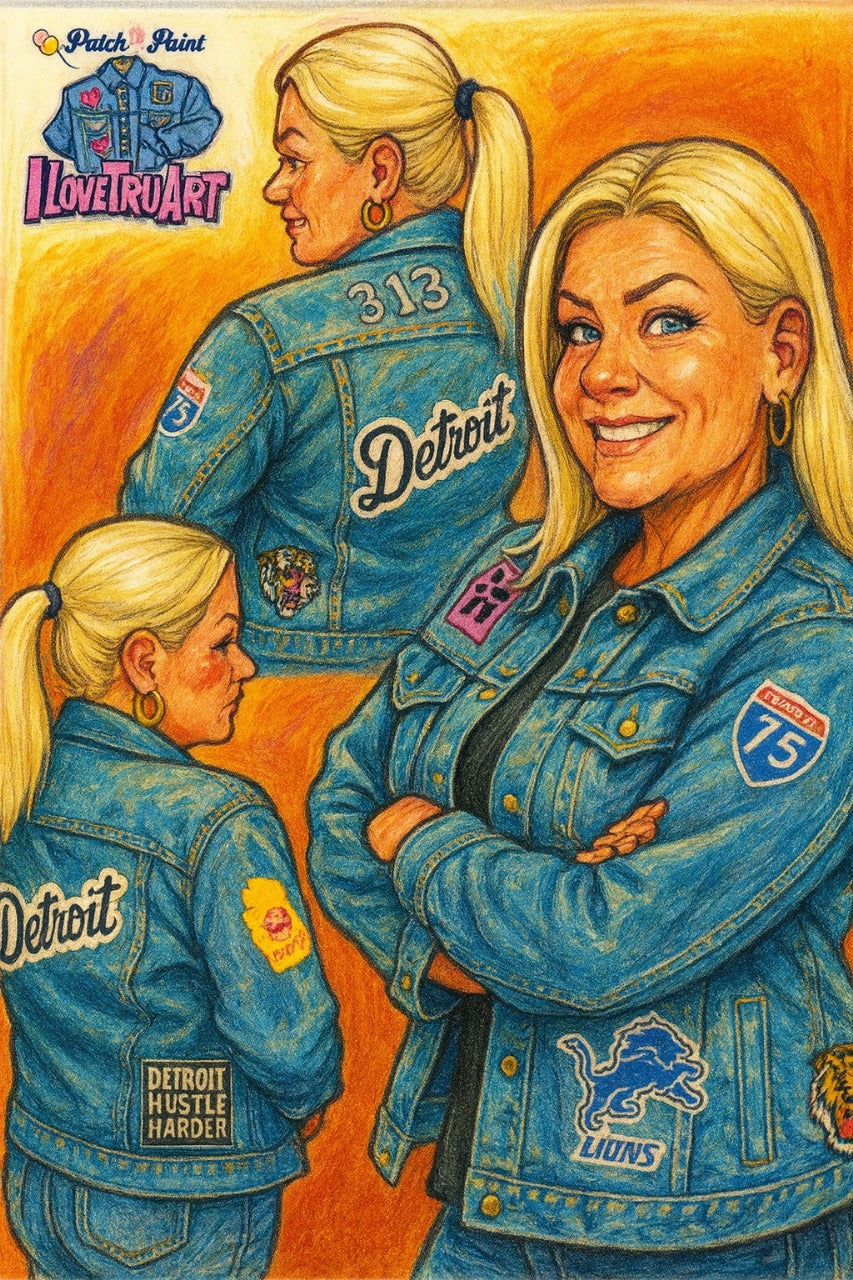Show off your city pride with the lloveTruArt Detroit Denim Jacket — a handcrafted streetwear piece featuring bold, Detroit-inspired patches. Standout details include the iconic "313" emblem, Detroit script lettering, I-75 interstate sign, Detroit Lions logo, and the “Detroit Girls Hustle Harder” patch. This luxury denim jacket celebrates the grit, spirit, and style of the Motor City. Perfect for casual wear, events, or travel, it blends art, fashion, and Detroit culture into one iconic look.